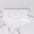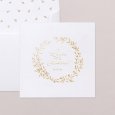 Olijftakken als symbool voor vrede, omringen triomfantelijk de namen van het bruidspaar, het geheel met goudfolie afgewerkt, en kondigen zo de aanstaande belofte van liefde en trouw aan. Deze elegante trouwkaart Giovanna staat in het teken van zuiver wit en een touch of gold voor een klassieke chique bruiloft. Te verkrijgen in meerdere kaartformaten.