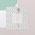 Dubbelzijdige vierkante huwelijksuitnodiging van hoog kwalitatief papier. Om de bloemen vast te maken, schuif je de stelen door de twee hiervoor voorziene perforaties.