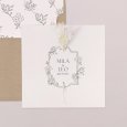 Dubbelzijdige vierkante huwelijksuitnodiging van hoog kwalitatief papier. Om de bloemen vast te maken, schuif je de stelen door de twee hiervoor voorziene perforaties.