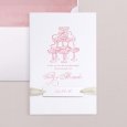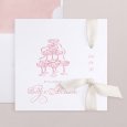 De trouwuitnodiging Sparkling Love valt op door de stijlvolle weergave van een champagnepiramide, versierd met een fijn, decoratief lint. Dit elegante ontwerp is perfect om een romantische en elegante bruiloft aan te kondigen.