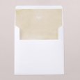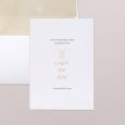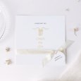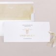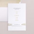 Op de trouwuitnodiging Bow and Rings zijn twee gouden ringen met een stijlvol lint verbonden. De namen van het bruidspaar, prachtig in goud afgewerkt, kondigen uw aanstaande huwelijk op een gevoelige en elegante manier aan.