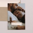 Een sprekende verlovingsfoto staat centraal op deze trouwkaart. Strakke tekstvlakken wisselen zich af met zachte kleuren, een moderne speling voor een bruiloft in het thema van casual chic!