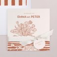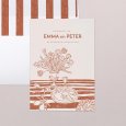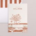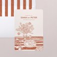 De idyllische Amalfikust inspireerde de trouwkaart Sorrente. Op de voorkant praalt een schets van een mooie eettafel in Mediterrane stijl in zachte terracotta tinten. De kaart biedt een belofte voor een zonnige trouwdag met het ware 'dolce vita' gevoel.