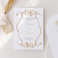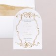 Op de Organdi trouwkaart omhult een lint, geschilderd in aquarel, de namen van het bruidspaar die in glimmend gouden letters op de kaart zijn geplaatst. Deze uitnodiging straalt elegantie en verfijndheid uit, en voorspelt daarmee een chique ceremonie die absoluut niet gemist mag worden.