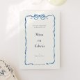 Op de Galon Bleu trouwkaart staat een delicaat blauw lint dat met aquarel geïllustreerd is. Het blauwe lint wikkelt zich om de namen van het aanstaande bruidspaar. Het is op deze manier een fijne, poëtische trouwkaart die de toon zet voor een chic huwelijksfeest.