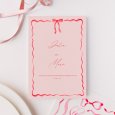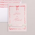 Een prachtig geschilderd lint versiert uw bijzondere aankondiging op de trouwkaart Satine. De elegante letterstijl en roze tinten geven de kaarten een luchtig effect: ideaal voor een chique en romantische trouwdag.