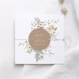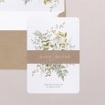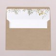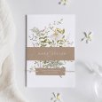 Een boeket van varens, kruiden en kleine bloemen vermengt zich op de trouwkaart Arpèges. Het kraftpapier en de elegante typografie completeren deze samenstelling met een landelijke uitstraling, ideaal voor een natuurlijk chique bruiloft.