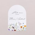 Met zijn elegante boogvormige uitsnijding zal deze huwelijksmenukaart, passend bij je uitnodigingen, prachtig passen bij je tafeldecoratie. Presenteer ze op elegante houten menuhouders (optioneel verkrijgbaar), leg er een op elk bord en maak ze extra speciaal met een mooie strik...