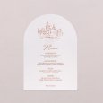 Met zijn elegante boogvormige uitsnijding zal deze huwelijksmenukaart, passend bij je uitnodigingen, prachtig passen bij je tafeldecoratie. Presenteer ze op elegante houten menuhouders (optioneel verkrijgbaar), leg er een op elk bord en maak ze extra speciaal met een mooie strik...