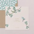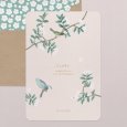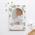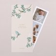 De doopkaart Vredig is gevuld met groene takjes, witte jasmijn bloemetjes en vogeltjes in zachte kleuren. Deze uitnodiging zal je foto dan ook prachtig in de kijker zetten. Kondig de doop van je kindje aan met een vleugje po?zie!