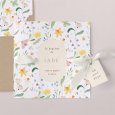 De doopkaart Yellow Spring schetst een zonnig beeld in warme gele tinten – perfect om een lentefeest of zomerfeest aan te kondigen. Een krans van narcissenbloemen en een kleine bij versieren dit liefdevol ontworpen, delicate ontwerp.