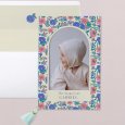 Vier de doop van je kind met de uitnodigingskaart van Siloé. Delicate aquarelbloemmotieven in zachte tinten roze, blauw en groen zijn te zien op deze uitnodigingskaart en kondigen je geluk zachtjes aan.