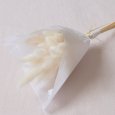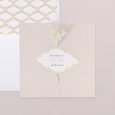 Deze doopuitnodiging wordt gepresenteerd als een gevouwen vierkante kaart, gevouwen in het midden. Twee perforaties aan de voorkant van de kaart maken het mogelijk om een steeltje gedroogde bloemen door te steken (optioneel en tegen meerprijs).