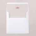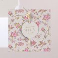 Deze doopuitnodiging wordt gepresenteerd als een gevouwen vierkante kaart, verfraaid met een geperforeerd rond labeltje. Twee perforaties zijn voorzien op de voorkant van de kaart om een lint en een steeltje gedroogde bloemen door te steken (beide zijn optioneel en tegen meerprijs). Om alles bij elkaar te houden, steek je de bloemen en het lintje door het label en knoop je het lintje vast.