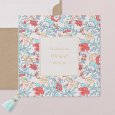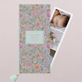 De doopuitnodiging wordt gepresenteerd als een kaart in portretformaat, bestaande uit een centraal kaart en twee zijkaarten die beweegbaar zijn. Bij het openen onthullen deze laatsten de belangrijke details van de doop van jouw kind. Ze kunnen gesloten worden gehouden met behulp van een mooi lint (optioneel en tegen meerprijs).
